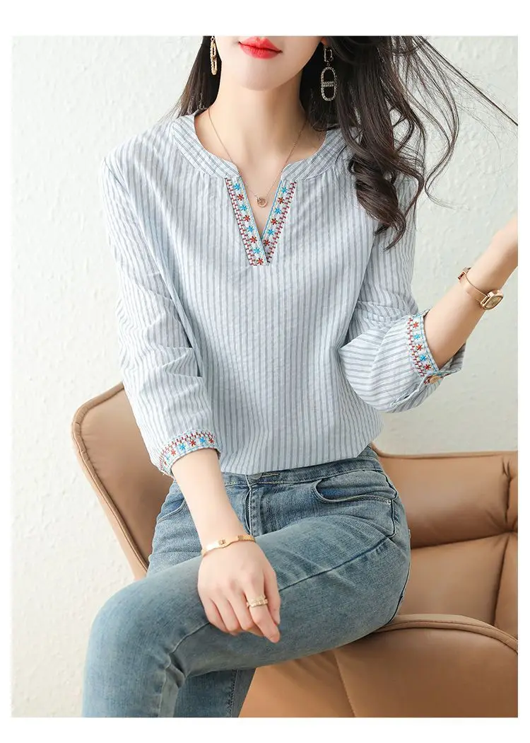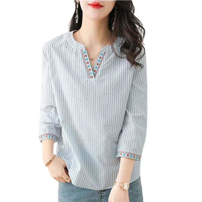 High-concerned chemical: None Clothing Patterns: Loose Dress Patterns: Pullover Season: Spring/Summer Combination Form: Single-piece Set Age: Middle Age Thickness: Cotton Liner Shirts Type: Casual Shirts Model Number: Blouses Fabric Type: COTTON Decoration: Embroidery Material: COTTON Sleeve Length(cm): Three Quarter Gender: Women Place Of Origin: China (mainland) Sleeve Style: regular Clothing Length: regular Collar: V-Neck Pattern Type: Striped Style: Beach Style Elasticity: Non Strech Origin: Mainland China CN: Fujian Fit Type: Regular Fit